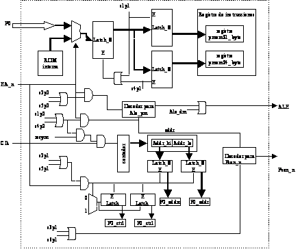De manera general, el bus de direcciones es conectado directamente con una señal llamada PC_aux, la cual contiene el valor de dirección del la localidad de memoria de programa que se desea leer, el bus de dato es conectado a una señal llamada data_ROM que se encarga de comunicar el valor sacado de la ROM con el registro de instrucciones pmem_s1_byte o pmem_s4_byte, siempre y cuando la señal Enable reciba el adecuado nivel lógico a través del pin EA_n, el cual permite elegir entre la ROM interna y una ROM externa. La Figura 4 muestra estas relaciones.