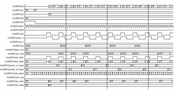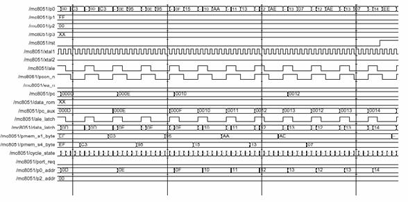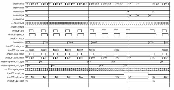 Figura 15. Resultado de la simulación de la descripción en VHDL del 8051.