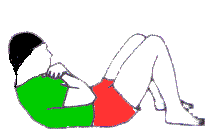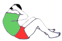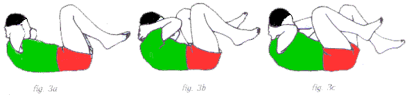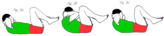 Este ejercicio se inicia partiendo de la misma posición que el anterior, pero con los dedos de las manos entrelazados detrás de la cabeza, a la altura de los oídos, y los pies levantados del suelo. Usaremos los músculos abdominales para aguantar la parte superior del cuerpo elevada en un ángulo de unos 30º con el suelo (fig.2a). Desde esta posición, tiraremos de los codos hasta que toquen los muslos, unos 4 cm. por encima de las rodillas (fig.2b). Regresaremos hacia atrás, como en la fig 2c, y nuevamente levantaremos codos y rodillas, como la fig. 2b. Mientras realizamos estos ejercicios abdominales, la parte inferior de la espalda debe mantenerse plana sobre el suelo en todo momento.