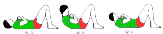 Partiremos de la posición de acostados sobre la espalda, con las rodillas dobladas, los pies planos encima del suelo y las manos cruzadas sobre el pecho (fig. 1a). Nos plegaremos hacia arriba, levantando los omoplatos unos 30º del suelo (fig. 1b), antes de bajar nuevamente (fig.1c). No inclinaremos la cabeza, no hacia arriba ni hacia abajo, pues podríamos lastimar el cuello; la mantendremos en una posición fija. Nos concentraremos en la mitad superior del abdomen, plegando la parte superior del cuerpo hacia delante, con la barbilla cercana al pecho (fig. 1b). Cuando bajemos la mitad superior del cuerpo, la parte posterior de la cabeza no debe llegar hasta el suelo, porque está con la barbilla tendiendo al pecho (fig.1c).