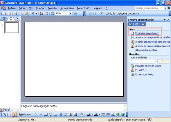 en Blanco. Oprima Aceptar y la ventana principal de PowerPoint