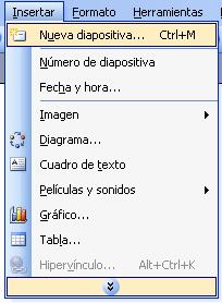 RESPUESTA: De clic en el menú Insertar y seleccione Nueva Diapositiva ó puede crearla con la combinación de teclas ctrl.+M