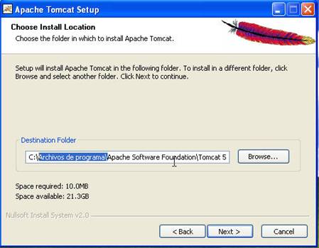 En este paso aparece la pantalla con una ruta donde se va a instalar el Tomcat y la aplicación para la generación de XML para las antenas de Radiodifusión. En este paso deberemos de cambiar la ruta que aparece, eliminando la parte marcada en azul de la misma y quedándose de la forma siguiente: