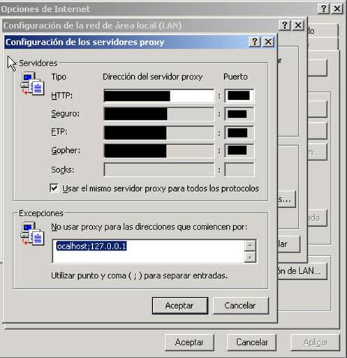 Como mejora de la aplicación se recomienda que en el Explorer se configure. Dentro del Explorer en Herramientas/opciones de Internet/ En la pestaña de Conexiones, se pulsa el botón "configuración de LAN", en la ventana siguiente pulsamos "Opciones avanzadas" y en las excepciones añadimos: