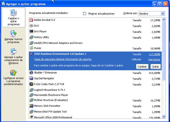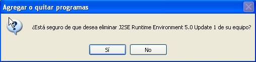 Aparecerá una ventana con todas las herramientas instaladas en su ordenador con muchas opciones de configuración. Buscar la opción J2SE Runtime Environment 5.0 Update 1 Pulsar en el botón de la derecha de Quitar para eliminarla.