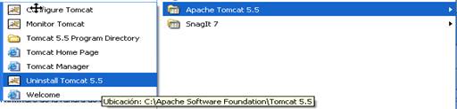 Aparecerá un listado con todos los programas instalados en el ordenador. Buscar el Apache Tomcat 5.5, pulsar sobre el.