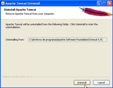 Dentro de las operaciones aparece Uninstall Tomcat 5..5.