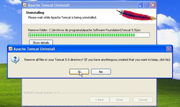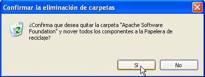 Mediante la desinstalación aparecerá un mensaje para borrar el directorio. Para que elimine los ficheros. Se pinchará en Si y así se continuará con la desinstalación de la aplicación y el Tomcat.