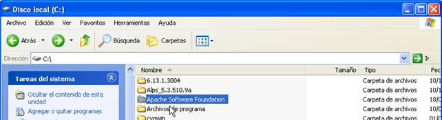 Para una completa desinstalación, y con el fin de eliminar carpetas residuales, se pasará a eliminar la carpeta del Apache Software Foundation. Esta carpeta, si se han seguido las recomendaciones para la instalación la encontraremos en c:\Apache Software Foundation. Si se hubiera cambiado en la instalación se debería buscar en la ruta especificada en la instalación