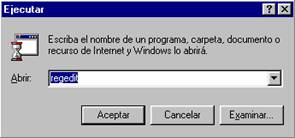 elegimos "Ejecutar.." y tecleamos "regedit" y pinchamos en Aceptar (o pulsamos