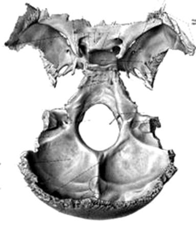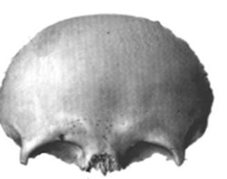 OCCIPITAL: Forma parte de la base craneal y de la cara posterior. La zona más amplia es la escama del occipital. Por debajo se encuentra el agujero Magno o agujero occipital. A los lados de este agujero hay 2 superficies articulares o cóndilos del occipital que se articulan con el atlas (C1), y por delante está la porción basilar del occipital