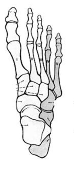Está formado por 5 huesos largos llamados metatarsianos. Se enumeran del 1 al 5 y de dentro hacia fuera (el dedo gordo es el 1º).