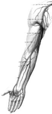 Un grupo de estas venas se dirigen hacia la cara anterior del antebrazo y se unen en la vena cefálica que sube por la cara externa del brazo hasta desembocar en la vena axilar.