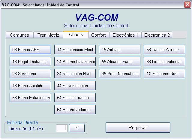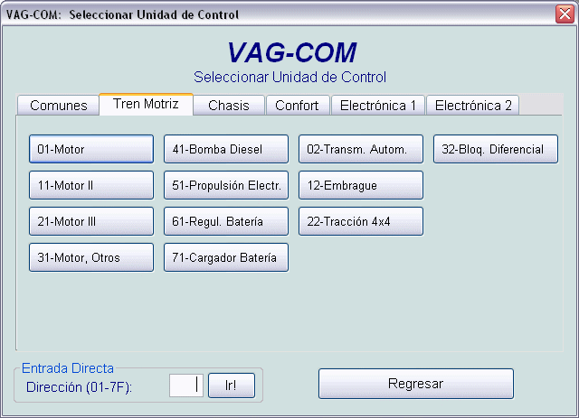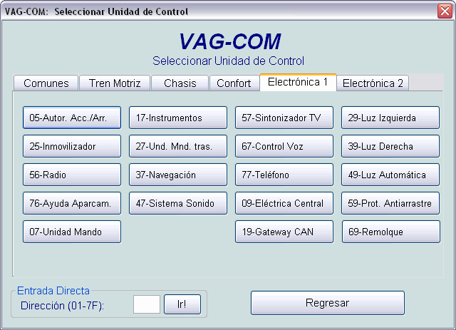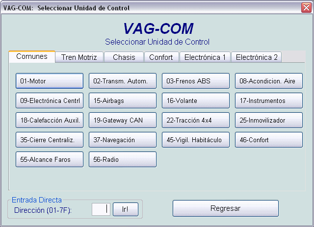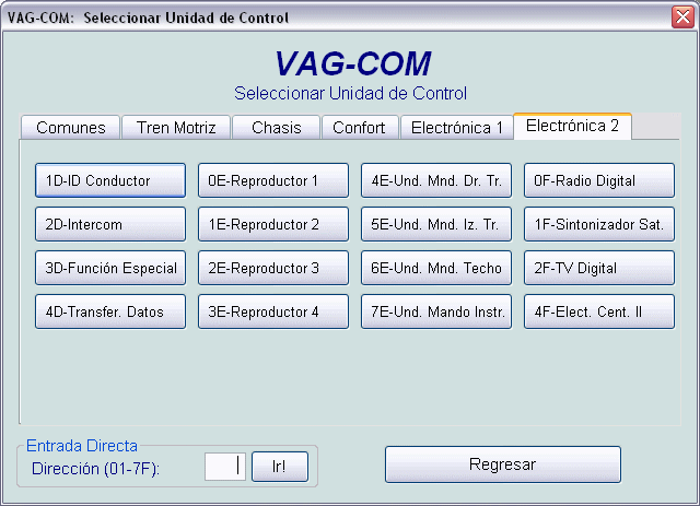 Ud. también puede entrar directamente alguna dirección manualmente, tal como se hace en el VAG 1551 y 1552. Simplemente entre la dirección (p. ej. "01" para motor) y haga clic en Ir! (No funciona en este demo)