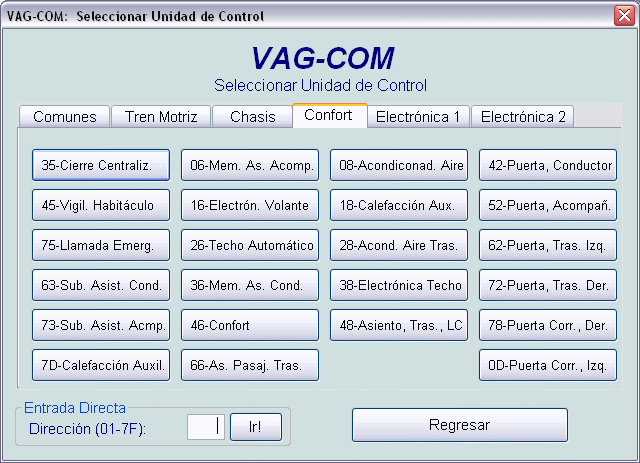 Para establecer la comunicación con una unidad de control particular, simplemente haga clic en el botón apropiado.
