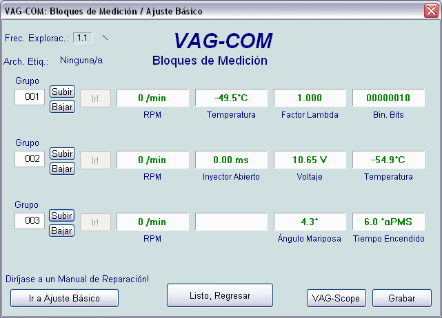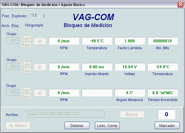 El Cambio a Ajuste Básico no está disponible en este momento mientras corre el Logging (tal vez lo añademos después). Sin embargo, Ud. puede iniciar a grabar salidas mientras están en Ajustes Básico. Si el VAG-COM sigue insistiendo que no puede abrir un archivo Log, probablemente le falta la carpeta de LOGS.