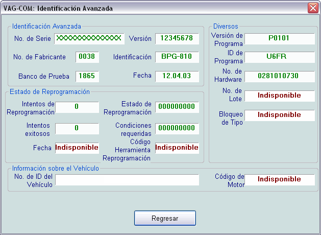 Los campos de Extra se usan para mostrar los datos de número de pieza para cualquier unidad de control esclava ó para el número de chasis (VIN) y el número de serie p.ej. del inmovilizador. Las nuevas unidades de control de confort central de VW tienen hasta cuatro unidades de control esclavas (una en cada puerta).