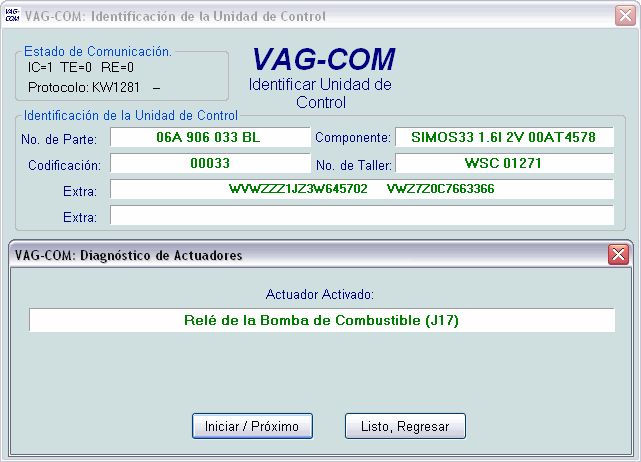 Esta pantalla aparece cuando el VAG-COM ha establecido la comunicación con una unidad de control.