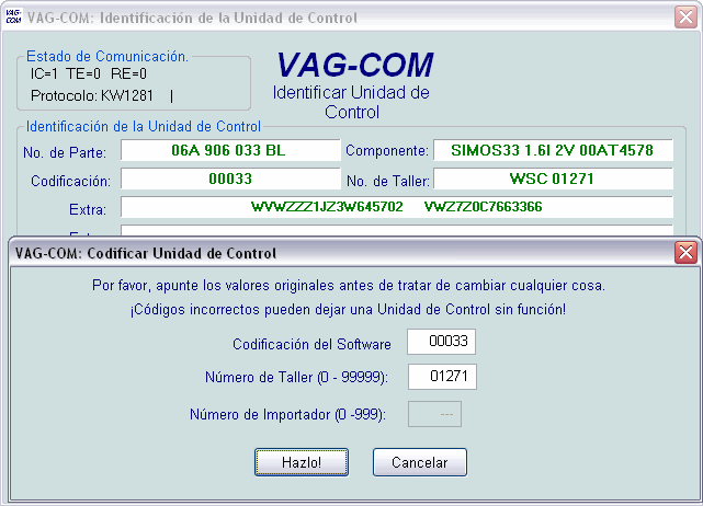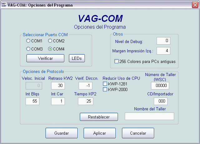 R: Cada agencia oficial de Volkswagen/Audi en todo el mundo tiene su propio Número de Taller que es único. Los lectores de averías oficiales VAG1551, VAG 1552 o VAS 5051, VAS 5052 recién comprados no funcionan hasta que un Número de Taller haya sido entrado, y una vez entrado el Número ya no se puede modificar. Cada vez que se Codifica una unidad de control o se efectúan ciertas Adaptaciones, el lector de averías manda su Número de Taller donde estará grabado después. Por eso, si se usa un lector de averías para hacer algo como apagar ciertos airbags, en principio debería de ser posible después ver quién (qué agencia) lo hizo. Igual que el lector de averías oficial, el VAG-COM acepta que se entre una vez un Número de Taller que después no se podrá modificar. Si Ud. no modifica el Número de Taller estándar 00000 en la Pantalla de Opciones, el VAG-COM trabajará en un "modo invisible", significa que en vez de mandar un Número de Taller fijo, el VAG-COM no tocará el Número de Taller que estaba grabado en la unidad de control, con una sola excepción: Si el VAG-COM encuentra el Número de Taller específico del VWTool/VDS-PRO, el VAG-COM lo reemplazará con algo más inocuo.