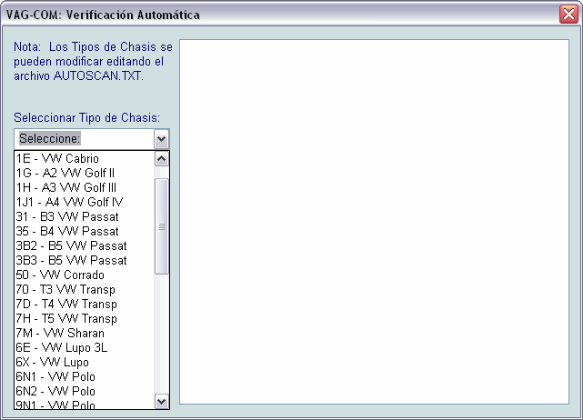 Esta es una simulación INTERACTIVA hecha con imágenes de pantalla reales. Esta es la pantalla principal que verá después de activar su VAG-COM. Aquí Ud. puede escoger las siguientes funciones: En Seleccionar Unidad de Control, Ud. puede seleccionar una sola unidad de control que Ud. quiera verificar, revisar, codificar o adaptar. En Verificación Automática, Ud. puede consultar automáticamente todas las unidades de control que tenga el vehículo, o sea con un sólo clic el VAG-COM le va a informar sobre todos los problemas electrónicos que tenga el vehículo. En Buscar Unidades de Control, Ud. puede buscar todas las unidades de control del vehículo si Ud. no sabes cuáles/cuántas tiene. En Funciones de OBD-II / EOBD, Ud.