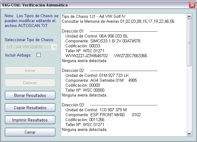 Este ejemplo es de una unidad de control de motor de un Polo modelo 1996 en el banco de prueba, por eso la gran cantidad de códigos de avería. Ud. puede ver que el VAG-COM le muestra los números originales de los Códigos de Avería y también los decodifica a texto informativo completamente en español.