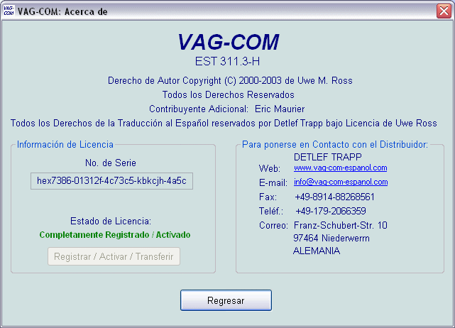No se preocupe si su copia registrada del VAG-COM se desactiva. Primero asegúrese de que su número de serie esté estable (apunte los últimos 4 dígitos del número de serie, y apague y arranque Windows unas cuantas veces para verificar si el número de serie sigue siendo constante). Entonces, mándenos su nuevo MID, código local y el número de serie junto con el nombre exacto de la versión que tiene instalado (vea www.vag-com-espanol.com/identificar_version.gif) a [email protected] ya que su antiguo código de activación ya no funcionará!