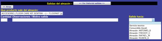 Para realizar una salida / traspaso se elegirá el producto y después se rellenarán los campos de Nº Maquina / Cantidad (según el producto), un campo de observaciones si se elegirá el destino: otra oficina, servicio técnico o salida de consumible (local).