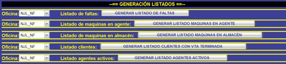 generar listados de almacén, maquinas en agente, faltas, clientes y agentes activos.