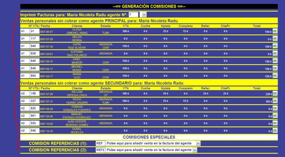 Una vez elegido el agente, saldrán las ventas que el agente tiene sin cobrar y también las comisiones especiales: referencias, DPS, controller, etc. que pueden implicar al empleado elegido.