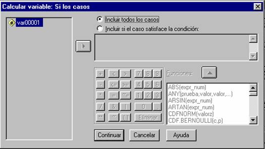 Si no se especifica nada más, los valores de la nueva variable se calculan para todos los casos, pero hay veces que por cualquier motivo sólo se necesitan calcular valores de la nueva variable para una determinada submuestra que verifica una condición determinada, en este caso se pincha en el botón Si... y aparece la siguiente ventana: