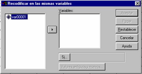 En el campo Variables se especifican los nombres de las variables que se van a recodificar.