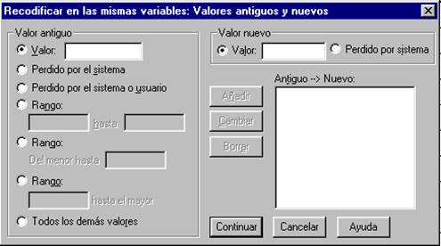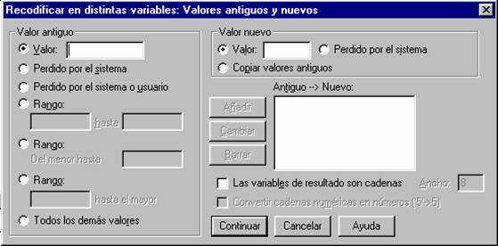 En esta ventana se realiza la recodificación de la misma forma que se hacía en el caso de recodificar en las mismas variables.