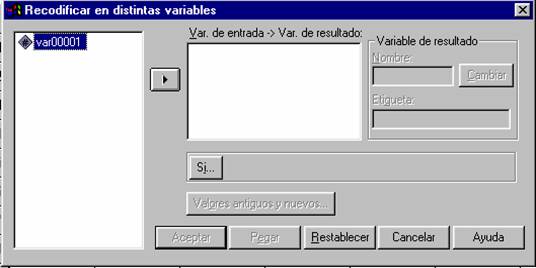 En el campo Var. de entrada -> Var. de resultado: se incluyen los nombres de las variables que se van a recodificar. En el campo Nombre: de Variable de resultado, se especifica el nombre que se va a dar a la nueva variable. Si se desea se puede especificar una etiqueta para la variable creada, especificándola en el campo Etiqueta: Después se pincha con el ratón en el botón de Cambiar y el nombre de la nueva variable aparecerá en el campo Var. de entrada -> Var. de salida: