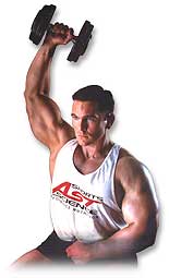Håll armbågen pekande upp, sänk ner hanteln under kontroll bakom huvudet och ge triceps full stretch. Med kraft sträcker du armen rakt upp.