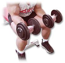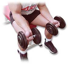 Sitt på en rak bänk med underarmarna vilandepå låren. Du ska hålla hantlarna med handflatan pekande uppåt och handlederna ska hänga över knäna.