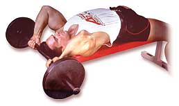 Lägg en curlstång på marken vid huvudet intill bänken. Placera kroppen så huvudet hänger ned över bänkkanten. Krök ryggen lite grann och greppa tag i stången. Håll armågarna inåt och tryck stången ovanför huvudet och sträck ut armarna tills vikten är över bröstkorgen.