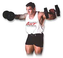 Med armarna lätt böjda så lyfter du kraftfullt hantlarna åt sidan lite högre än axlarna. Vid toppen av övningen så ska ditt lillfinger peka lite uppåt och tummarna neråt.