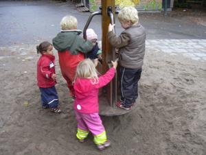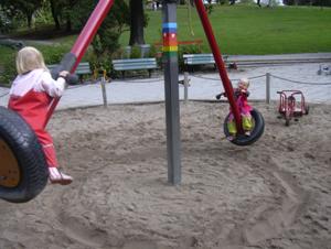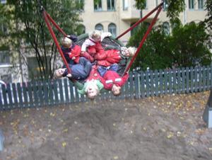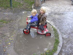 Elin och Alvis åkte runt, runt på den här skojiga gungan......William och Theodor körde fast i en vattenpöl