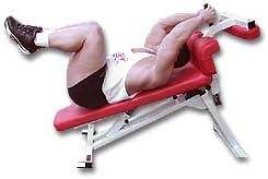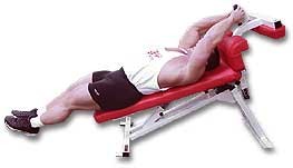 Ligg på den nedåtlutande bänken med fötterna pekande framåt mot golvet och händerna är bakom huvudet och håller i bänken.