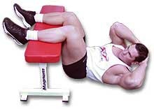 Lägg dig på golvet med händerna under huvudet och placera benen över en bänk. Andas ut när du curlar upp kroppen mot bänken, med ena armbågen mot andra sidan.