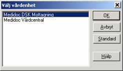 Numreringen i plocklistan är till för att skilja de olika vårdenheterna åt. Vårdenhetens identifieringssträng måste överensstämma med motsvarande vårdenhetsnummer i Medidoc. I Medidoc/Systemunderhåll 2/Vårdenheter finns samtliga enheter för den aktuella installationen. I den ordning som enheterna visas i Välj Enhet (uppifrån och ner) är de också numrerade. I detta exempel är Medidoc Vårdcentral enhet nr 2 och har alltså identifieringssträng 2. Max 10 vårdenheter går att lägga in. |
