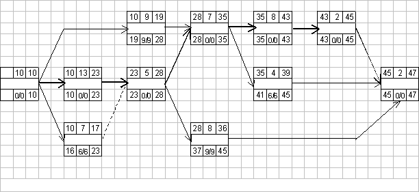 Початок будь-якого процесу на будь-якій ділянці, проставлений у лівому верхньому куті клітинки, не може бути за своєю величиною меншим, ніж закінчення попереднього процесу та тієї ж ділянки, проставленій у нижньому куті сусідньої лівої клітинки. У процесі розрахунку необхідно робити поправки або спробувати знайти клітинку, з якої слід починати розрахунок, керуючись правилом: за кожною парою процесів зіставляється тривалість їх виконання у діагональних клітинках у разі просування зверху вниз. Якщо усі строки правого стовпця будуть по діагоналі більше або рівні тривалостям лівого стовпця, то розрахунок слід починати зверху, а якщо менше – то знизу. У прикладі для першого і другого стовпців маємо 4 > 3; 2 > > > 2; 3 >