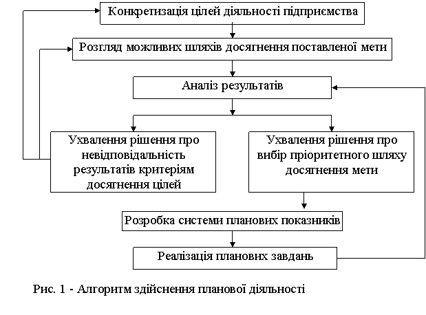 У процесі пла 141c26b 85;ування приймають рішення про вибір з можливих варіантів досягнення мети найбільш вигідного з економічної точки зору і необхідні для цього дії, тобто пла 141c26b 85;ування вимагає послідовної реалізації визначених дій, які можна уявити у вигляді наступного алгоритму (див. рис. 1).
