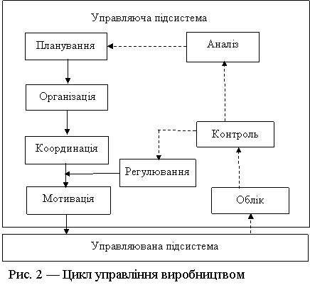 Схематично цикл управління виробництвом можна зобразити таким чином (див. рис. 2). Розкривши зміст функцій управління, ми підійшли до розуміння того, що висунуте раніше твердження про пріоритетність функції пла 141c26b 85;ування над іншими функціями управління є об'єктивним тому, що саме пла 141c26b 85;ування визначає мету і завдання реалізації цих функцій, виходячи з цілей розвитку підприємства. М. Мескон вказував, що «пла 141c26b 85;ування — це парасолька, під якою укриваються всі функції управління». Отже від рівня пла 141c26b 85;ування багато в чому залежить успіх управлінської діяльності, її ефективність.