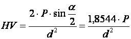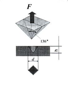 При вимірюванні твердо 818j92i 89;ті за Віккерсом в поверхню зразка втискують алмазний індентор у формі чотирьохгранної піраміди з кутом при вершині 136°. Після усунення навантаження Р, що діяло певний час (10-15 c для чорних або 30 с для кольорових металів), вимірюють діагональ відбитка d, що залишився на поверхні зразка. Число твердо 818j92i 89;ті за Віккерсом НV визначають діленням навантаження в кілограмах на площу бокової поверхні отриманого пірамідального відбитка: