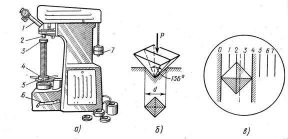 через важіль передає тиск вантажів 7 на алмазну піраміду і знімає навантаження при розвантаженні. Механізм, що навантажує, поступово повертається у вихідне положення. Залишкове зняття навантаження визначається за допомогою звукового сигналу. Потім столик приладу опускають і підводять мікроскоп 1, встановлений на штанзі і прикріплений до станини, і заміряють довжину діагоналі відбитка оптичним мікрометром. На окулярі мікроскопа є дві шторки: рухома і нерухома, з якою сполучається лівий кут відбитка. Мікрометричним гвинтом переміщують рухому шторку до зіткнення із правим кутом відбитка. Переміщення рухомої шторки викликає обертання цифрової стрічки покажчика. Цифра, що відповідає положенню рухомої шторки, коли вона стикається з кутом відбитка, і буде величиною довжини відбитка (рис. 6.4, в).