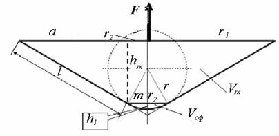Рис. 6.11. Схема виміру твердо 818j92i 89;ті конусом: F сила опору втискуванню індентора, Н; h=hзк+h1 глибина втискування конуса, мм; hзк висота зрізаної частини конуса, мм; h1 глибина втискування сферичної частини конуса, мм; r2 конуса, мм; r1 конуса, мм; Vсф сферичної частини конуса, мм3; Vзк