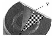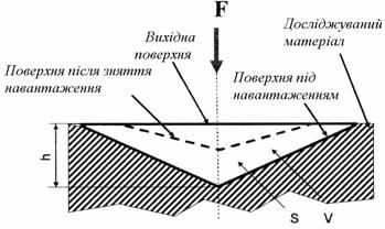 Рис. 6.14. Схема виміру універсальної і істинної нанотвердо 818j92i 89;ті пірамідою Берковича: F сила опору втискуванню індентора, Н; h глибина втискування індентора, мм; V втиснутої частини індентора, нм3; S