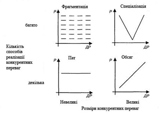 3) Фрагментація. До цієї категорії відносяться ті види діяльності, для яких не існує однозначних зв'язків між часткою ринку і прибутковістю (наприклад, послуги ресторанів, виробництво одягу, торгівля коштовностями). У них може бути багато джерел конкурентних переваг (місцезнаходження, якість продукції, рівень сервісу і т. і.). Відмінності між підприємствами полягають в тому, які конкретно шляхи реалізації конкурентних переваг з безлічі доступних альтернатив вони вибирають.