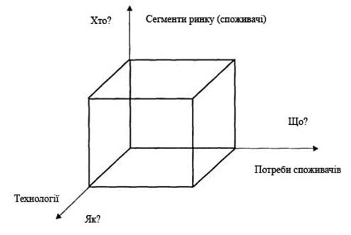 крок у визначенні бізнесу і в цілому в матричному підході зроблений Д. Абелем, який запропонував визначати область бізнесу в трьох вимірюваннях (рис. 5.4):